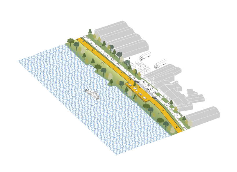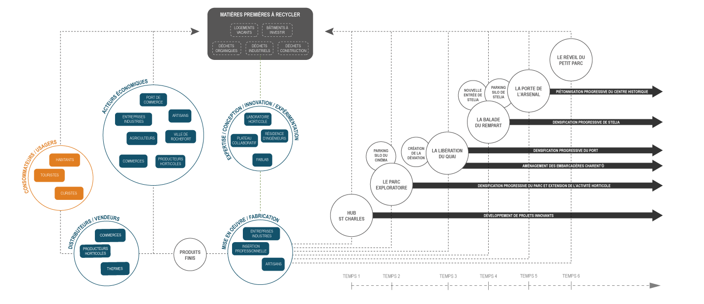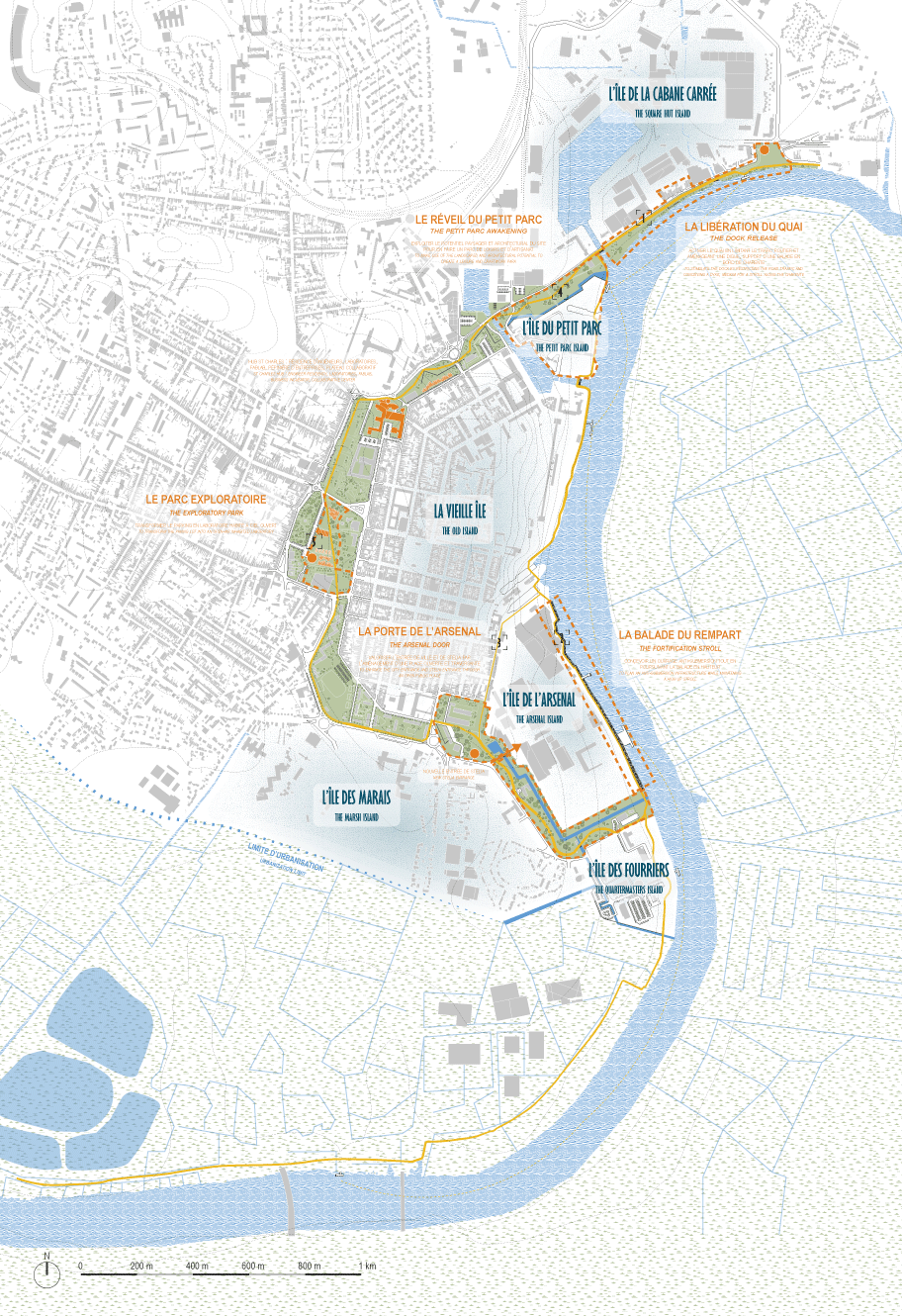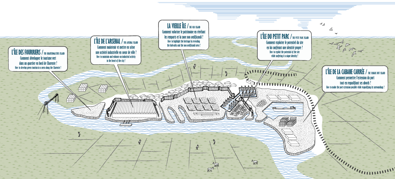des éléments isolés entretenant des liens importants et primordiaux. » Ainsi, l’enjeu pour la ville de Rochefort n’est pas celui de la mixité mais celui de l’affirmation et de la mise en relation de ces entités, pour créer un ensemble fonctionnel et productif. Le projet offre une vision de Rochefort à long terme et propose de redonner une lecture continue de la ville. Il tend à articuler ces fragments en activant leurs rives – supports de projets innovants, d’espace publics qualifiés et de mobilité réinventée – à l’interface entre les “îles” de la ville constituée et la nature.