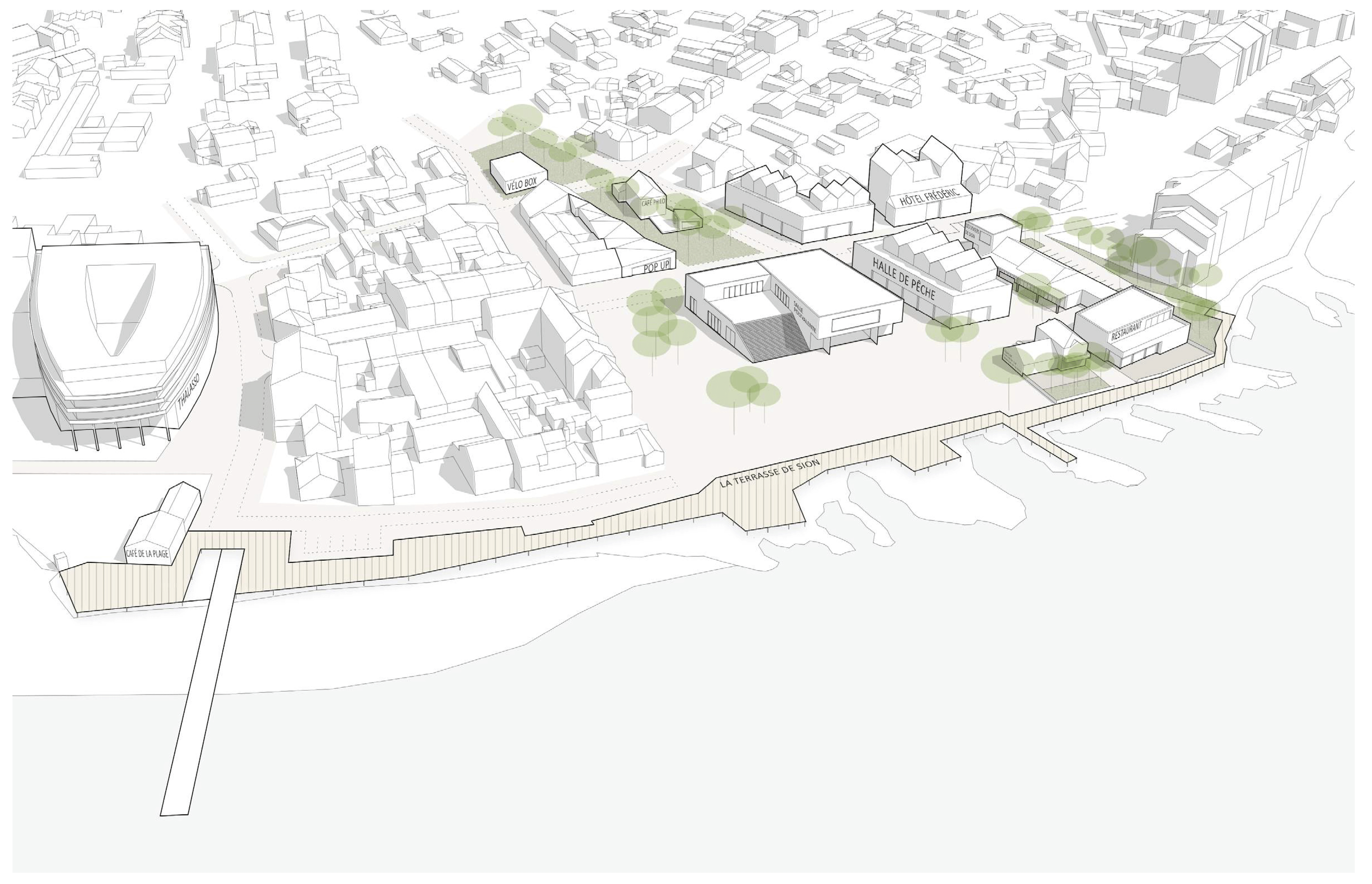 L’étude de programmation porte sur une friche située à quelques centaines de mètres du front de mer. En se réappropriant ce qui fait la richesse et le particularisme du tissu urbain, cette opération très dense articule les espaces publics autour de bâtiments pivots, dont les fonctions répondent au caractère saisonnier du quartier. La mobilité est retravaillée à l’échelle de Sion, tout en valorisant son rapport à l’océan, et propose un fonctionnement différenciée en basse et haute saison.